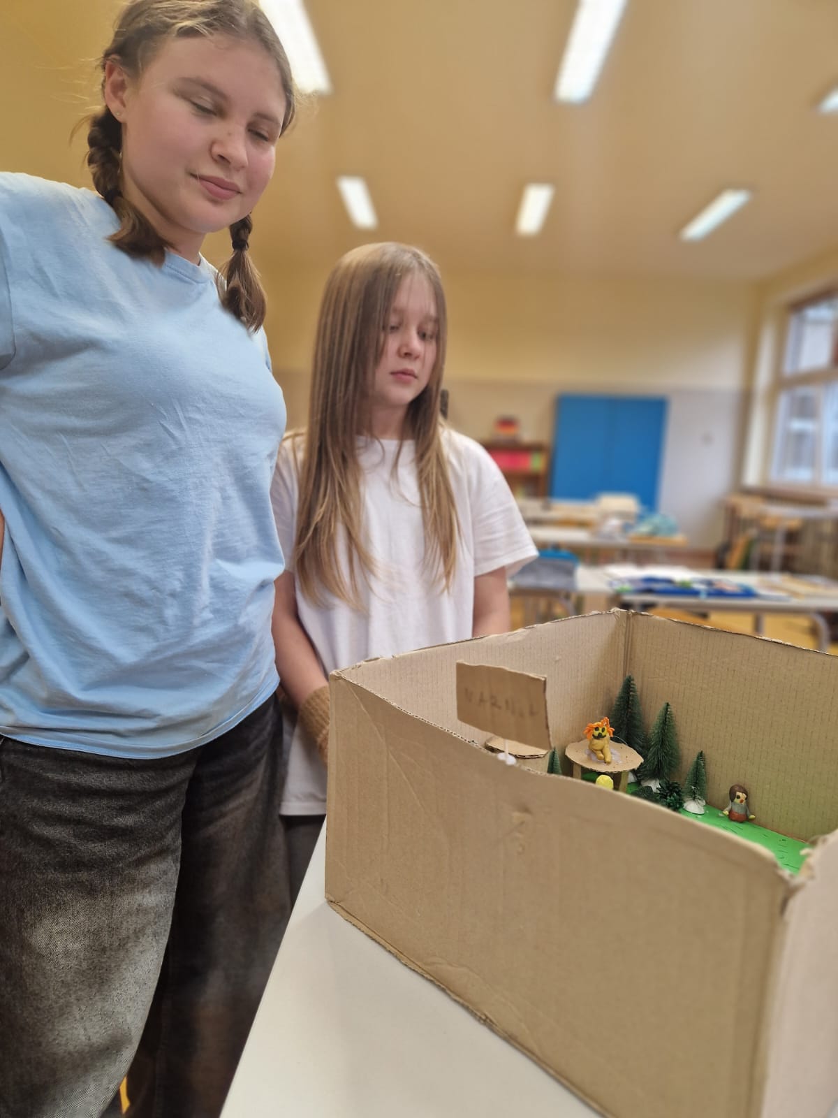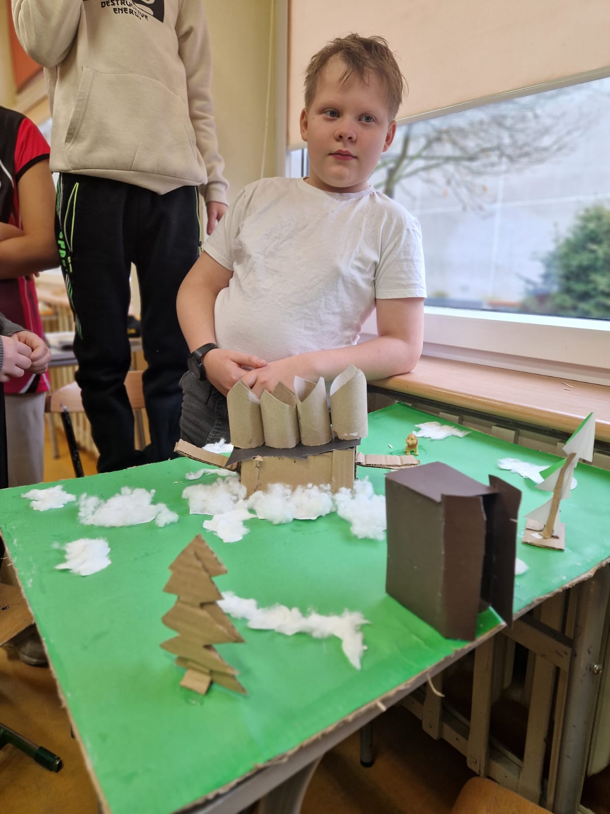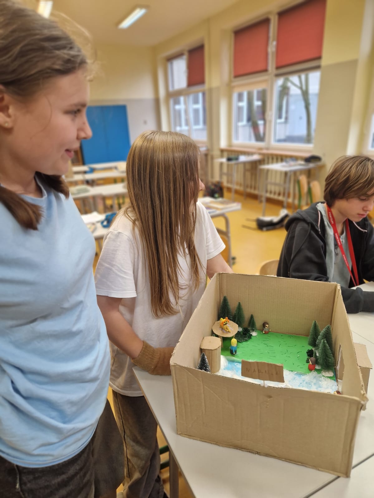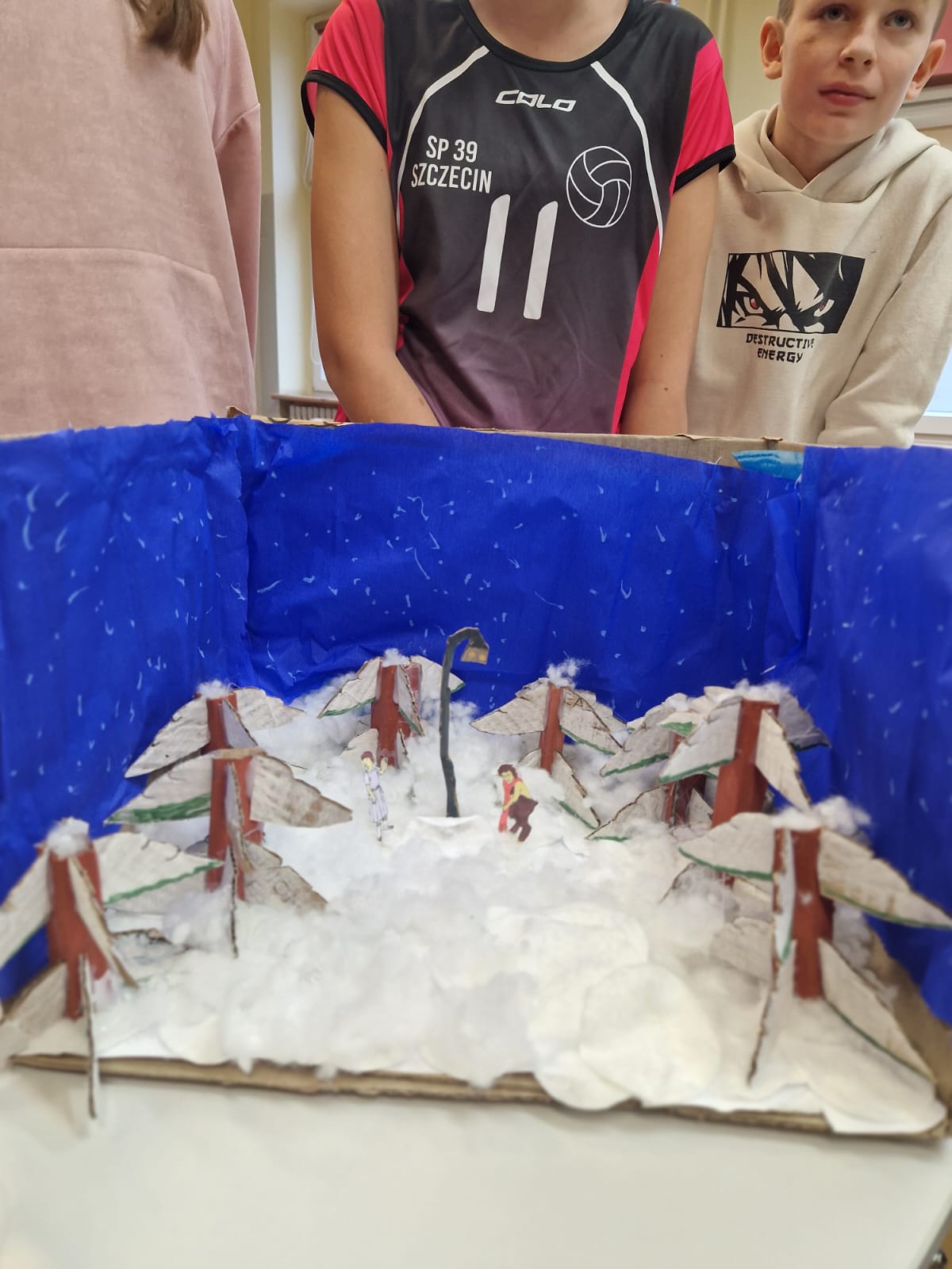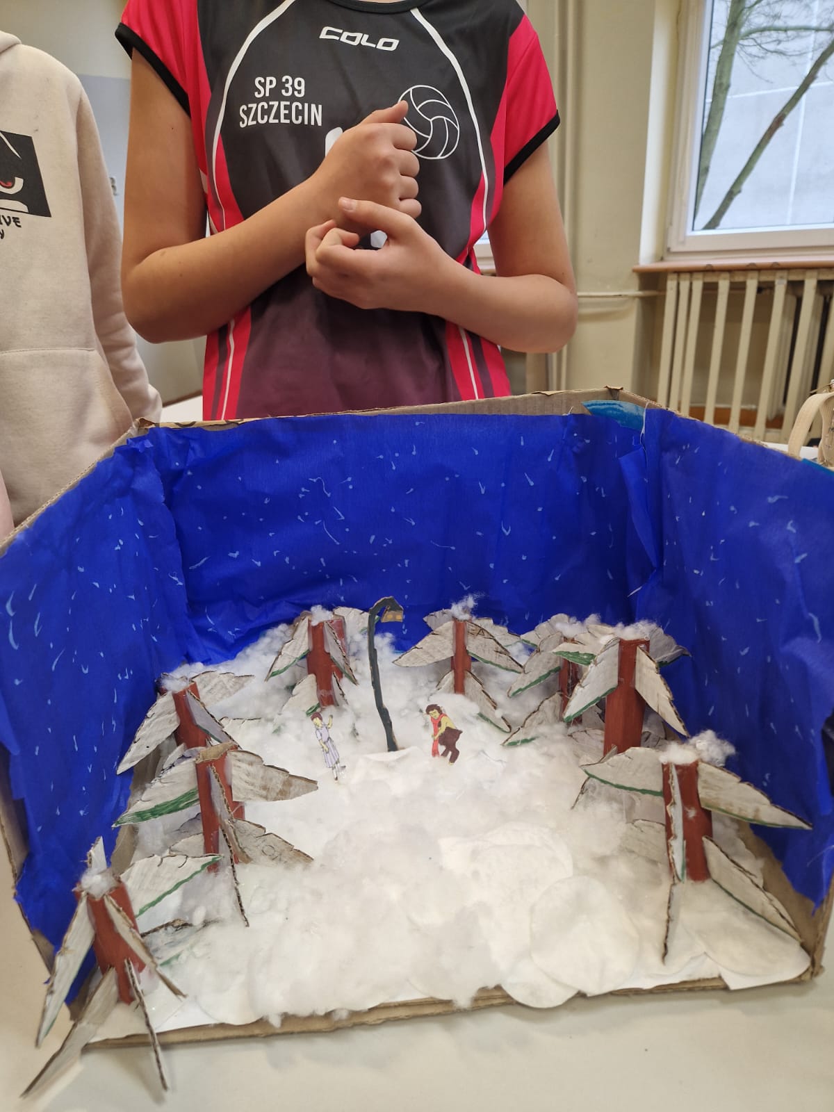 Na listopadowych lekcjach języka polskiego, uczniowie klasy 5B stanęli przed nie lada wyzwaniem – budowali makietę Narnii. Uczniowie musieli wyobrazić sobie, jak wyglądają magiczne miejsca, jak wyglądają postacie i jak przedstawić atmosferę panującą, w tej magicznej i niezwykłej, krainie. Praca nad projektem wymagała pomysłowości i kreatywnego podejścia do wykorzystania różnych materiałów (papier, karton, bibuła, gałązki, wata), aby odtworzyć elementy Narnii. Wykonanie makiety pozwoliło uczniom dosłownie wejść do świata wykreowany przez C.S. Lewisa, co było dla każdego ucznia cennym doświadczeniem edukacyjnym.